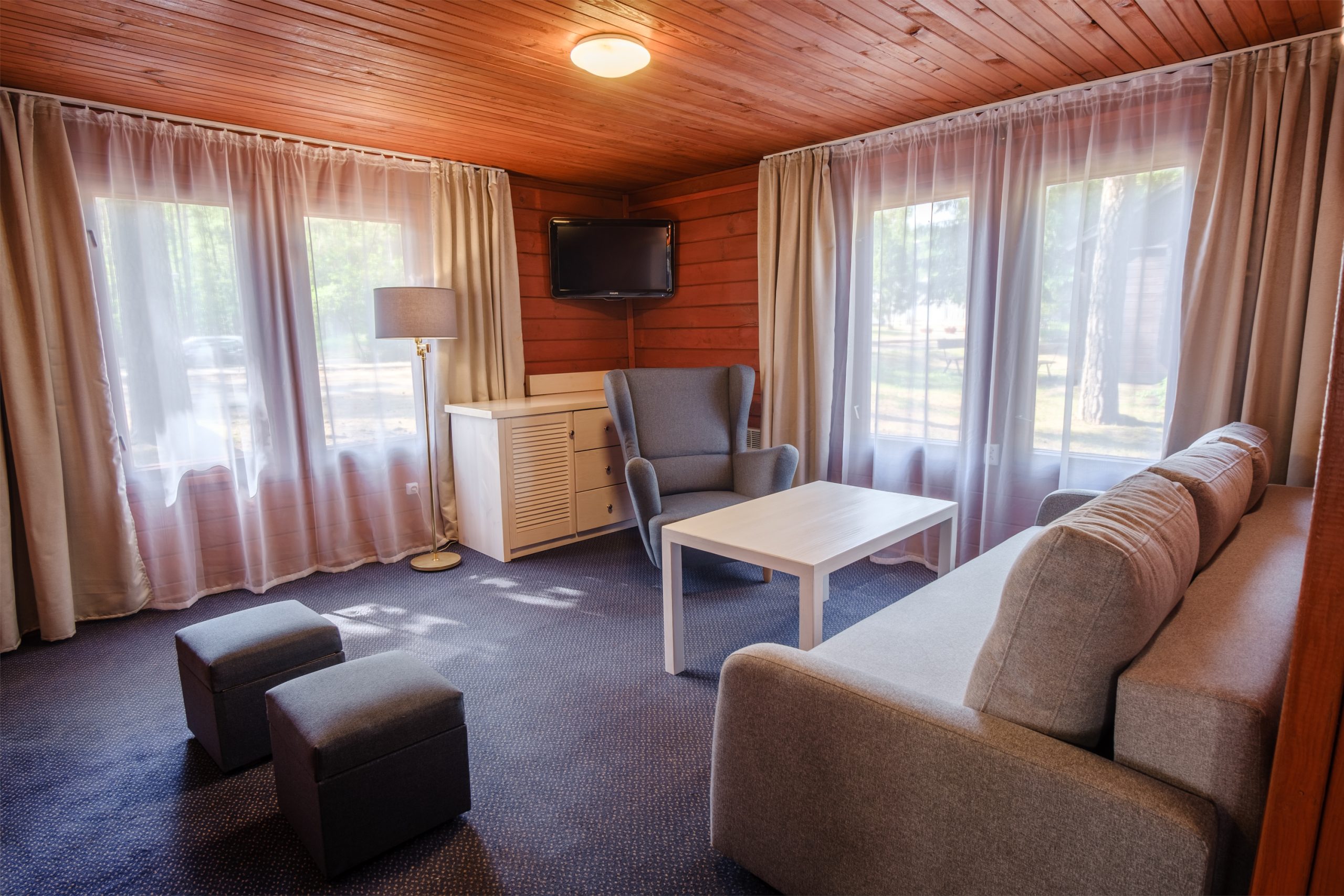 Domek 6-osobowy z salonem to przestrzeń dla rodzin z dziećmi lub grup, które chcą spędzać czas razem. Wewnątrz są dwie sypialnie z łóżkami pojedynczymi, które można łączyć oraz salon z rozkładaną kanapą dwuosobową – idealny do wypoczynku w ciągu dnia.